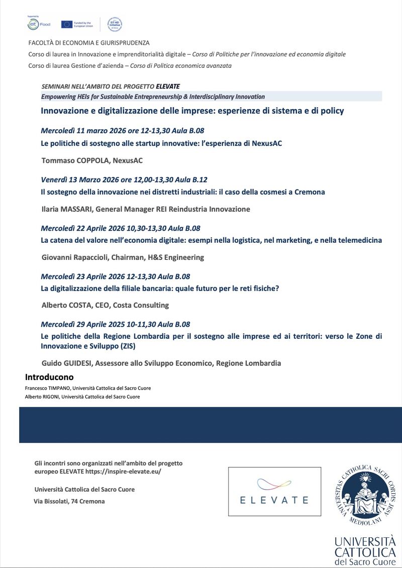 The ELEVATE consortium is pleased to announce the launch of a new seminar series within the course “Innovation Policy and Digital Economy”, part of the Bachelor’s Degree in Digital Innovation and Entrepreneurship at Università Cattolica del Sacro Cuore (UCSC). The initiative is carried out within the framework of the ELEVATE Project and is coordinated by Francesco Timpano and Alberto Rigoni.